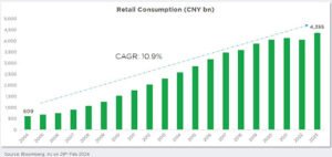 China’s shift from an export-led growth provides massive opportunities for domestic consumption. Despite several economic upheavals, retail consumption has grown at ~11% CAGR over 20-yrs
